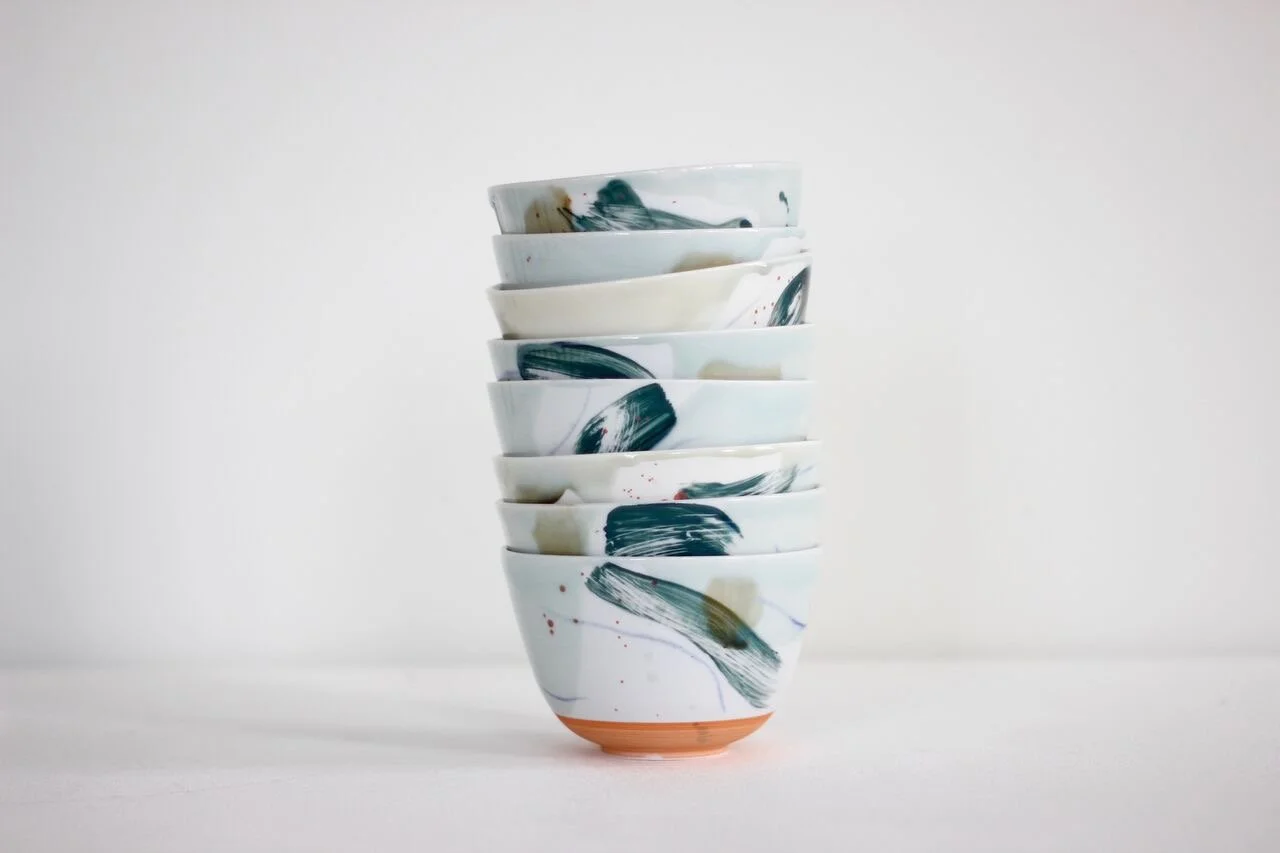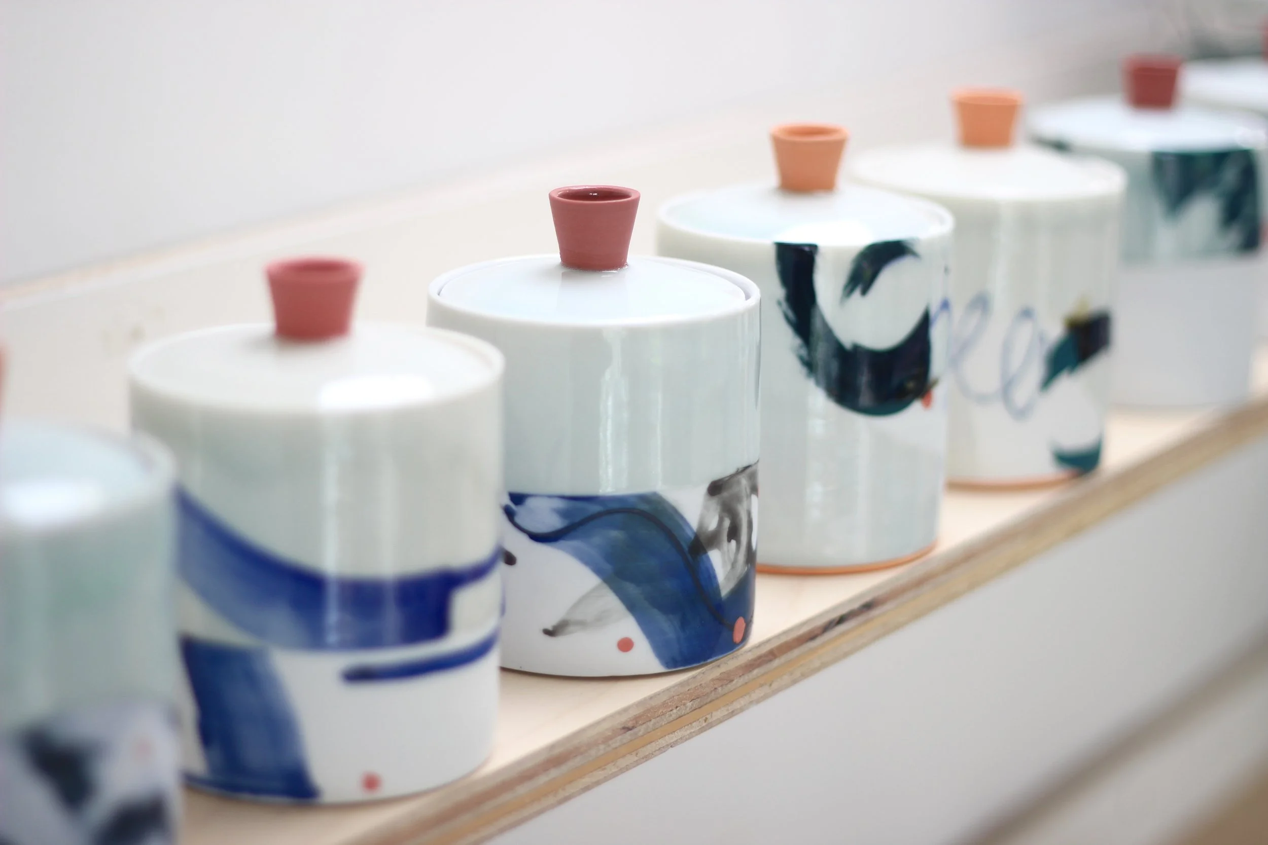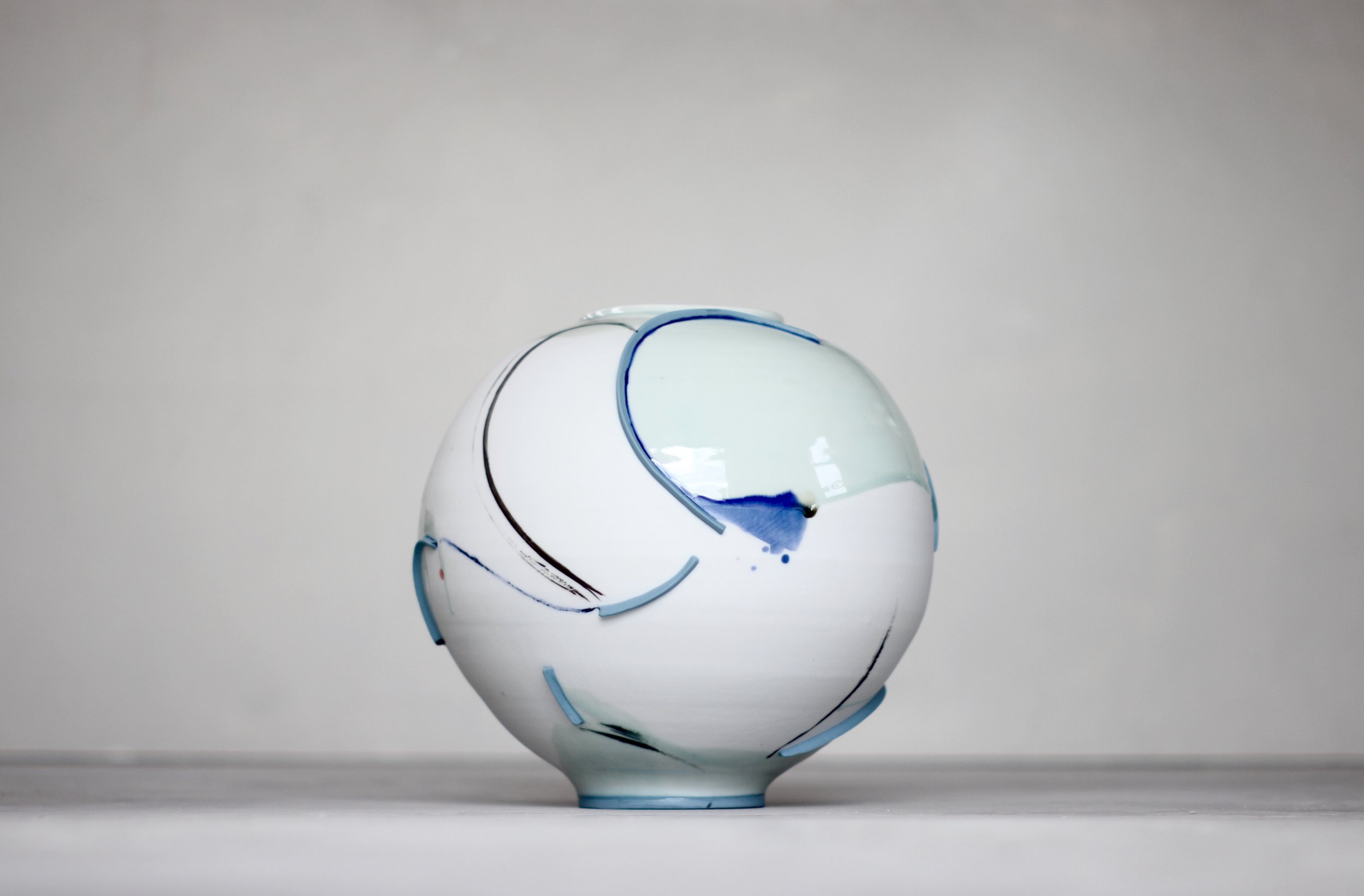 Adam’s work centres on the potter’s wheel. Traditional eastern forms inspire him, but spontaneity as a means of personal expression is key to his work. The exuberant action of throwing is enhanced by a continued experimentation through process, form and colour. Mark Making is intuitive, sometimes relating to form, or process of making, sometimes it’s part of a personal narrative.