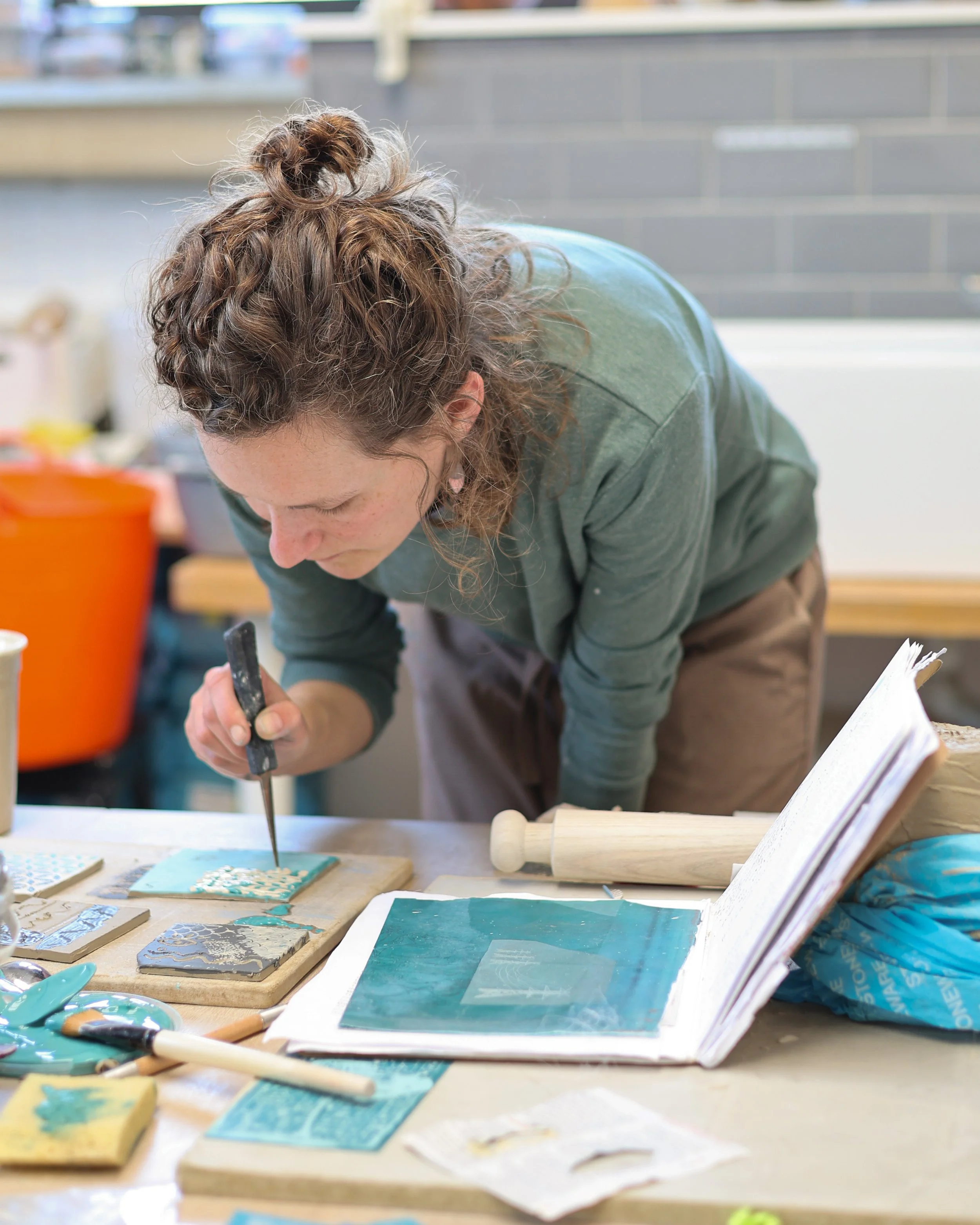 You should wear comfortable clothes which you don’t mind getting a bit of clay on! Layers can be a good idea as temperatures can be a little variable. All students should wear comfortable, flat shoes with non-slip soles and covered toes, and bring an apron/cover-up. Long hair should be tied back for wheel work. We also recommend that jewellery, watches and other valuables are left at home.